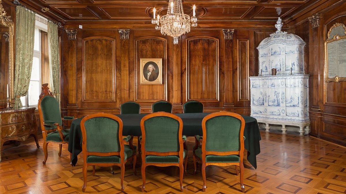 Die grösse Stube, ausgestattet um 1774, ist eines der schönsten Interieurs von Bern. Die Wände und die Decke sind mit lasiertem Nussbaumtäfer verkleidet, verziert mit vergoldeten Schnitzereien. Ein beeindruckender blau-weisser Kachelofen von Peter Gnehm (1744) schmückt die Saalecke. Besonders stolz sind wir auf die beiden Louis XV-Kommoden (1775) von Mathäus Funk mit einer Marmorabdeckung aus dem Oberhasli sowie die eleganten Fauteuils und Stühle im französischen Stil.